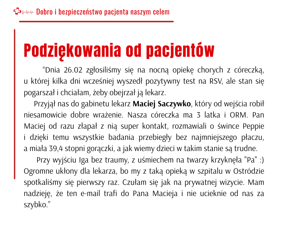 Nic tak nie poprawia nam humoru, jak wiadomość, że nasi pacjenci – zwłaszcza ci najmniejsi – wychodzą od nas z uśmiechem na twarzy. Otrzymaliśmy przepiękne podziękowania dla pana doktora Macieja Saczywko, który opiekował się 3-letnią Igą podczas nocnego dyżuru.